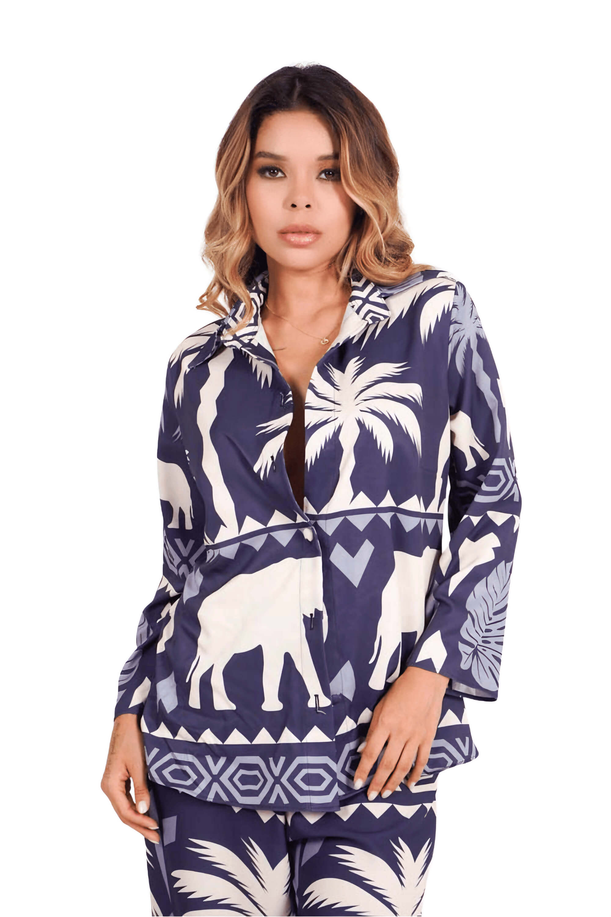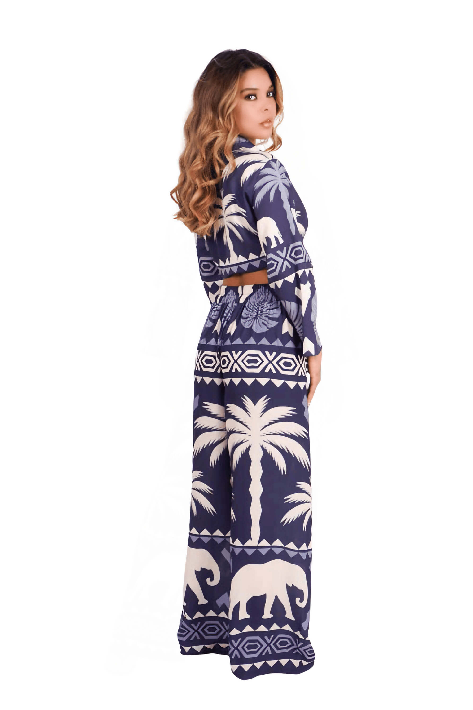 El estampado combina palmeras, figuras geométricas y elefantes en tonos azul marino y marfil, creando un look bohemio, sofisticado y lleno de fuerza visual. Es perfecto para viajes, eventos tropicales, días relajados de verano o looks statement que no pasan desapercibidos.