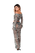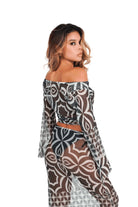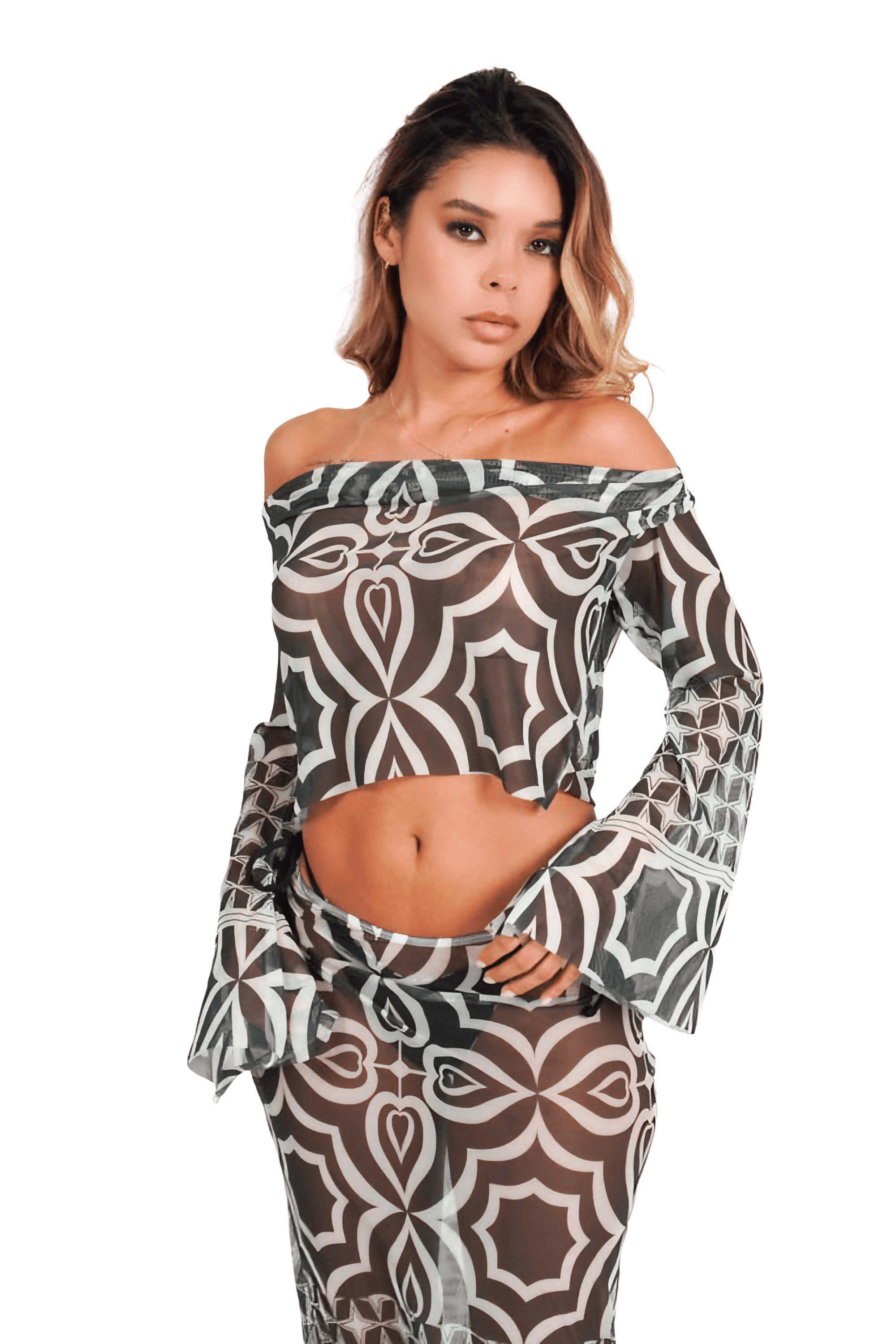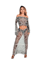 Set boho-chic con crop top off-shoulder y falda maxi semitransparente. Estampado geométrico moderno, fresco y perfecto para estilo resort.