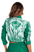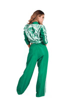 Set verde sporty chic: chaqueta crop estampada + pantalón jogger palazzo.