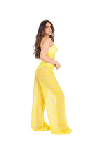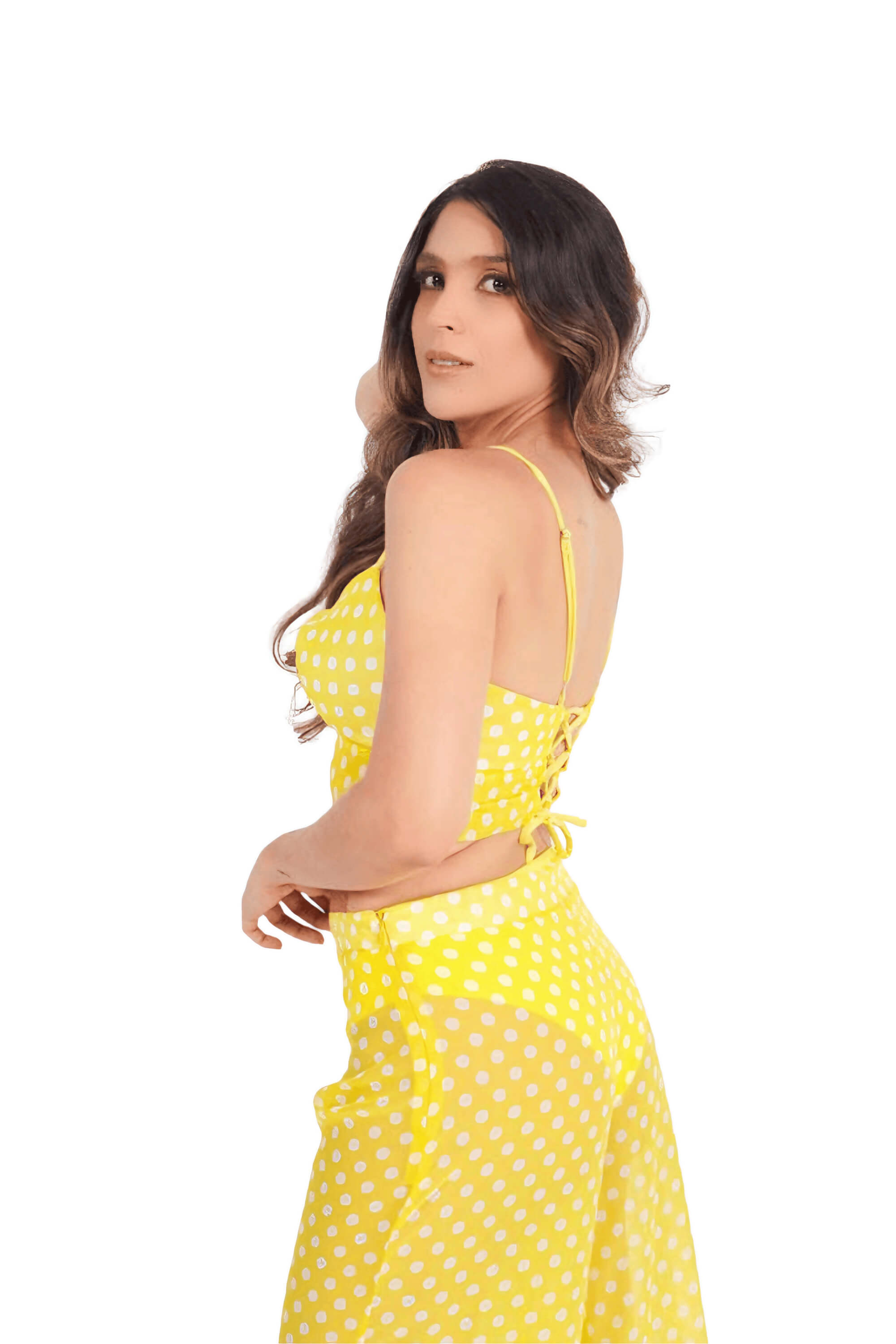 El estampado de lunares blancos sobre amarillo vibrante aporta un aire retro muy femenino, mientras que la silueta fluida del pantalón brinda comodidad y movimiento natural. Es una opción perfecta para días cálidos, salidas casuales, vacaciones o eventos de día donde quieres destacar sin esfuerzo.