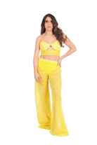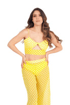 Set amarillo estampado con crop top cut-out y pantalón palazzo. Fresco, juvenil y perfecto para días soleados.