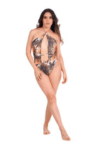 El Trikini Sunset Palm es una pieza icónica diseñada para resaltar la figura con sensualidad y elegancia. Su estampado tropical en tonos tierra, beige y anaranjados evoca atardeceres cálidos y vibra caribeña, perfecto para elevar cualquier look de playa o piscina.