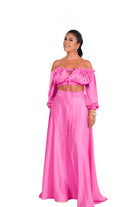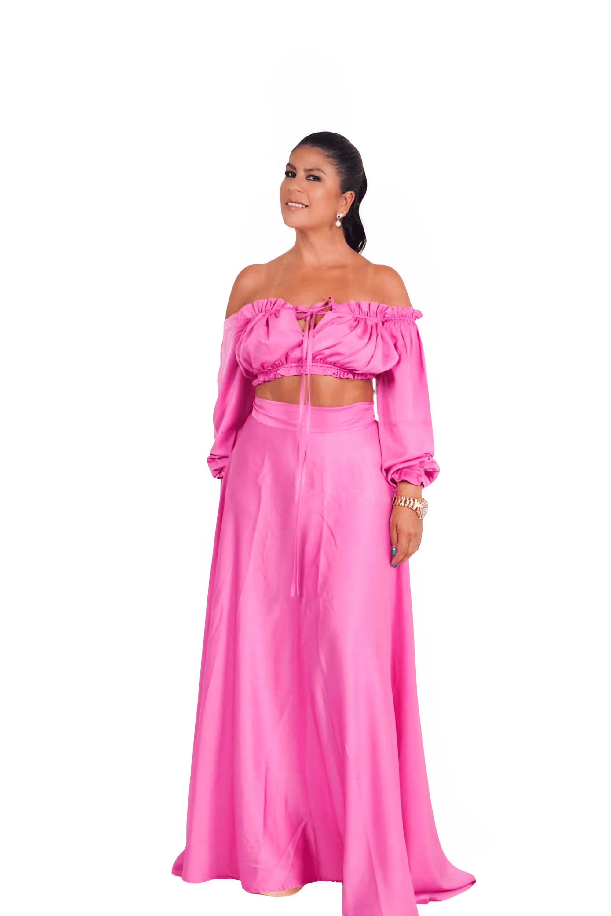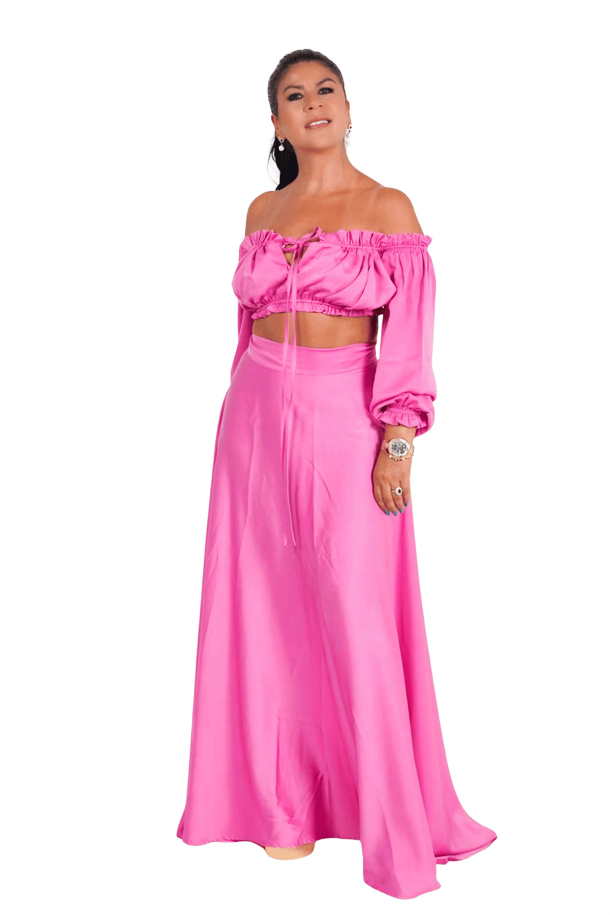 Set rosa vibrante con top off shoulder ajustable y falda maxi fluida.