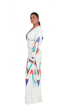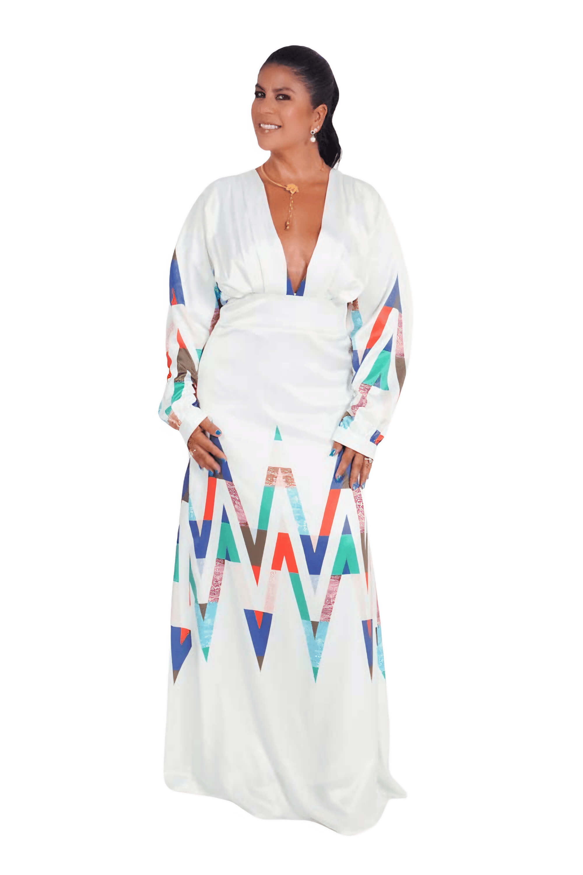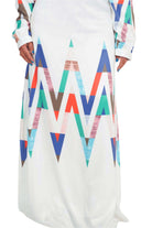Maxi vestido blanco con estampado geométrico multicolor, escote profundo y mangas largas.