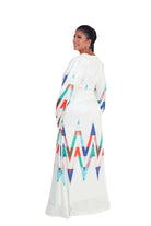 El estampado geométrico en tonos vibrantes —azules, verdes, naranjas y detalles tierra— se distribuye de manera estratégica en la falda y mangas, creando un contraste espectacular sobre la base blanca. Este diseño genera un efecto visual alargado y refinado, ideal para destacar en eventos especiales, celebraciones o salidas donde quieras lucir única.