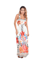 Maxi dress con cut-out lateral, tirantes anchos y estampado tropical vibrante. Fresco, elegante y perfecto para estilo resort y días cálidos.